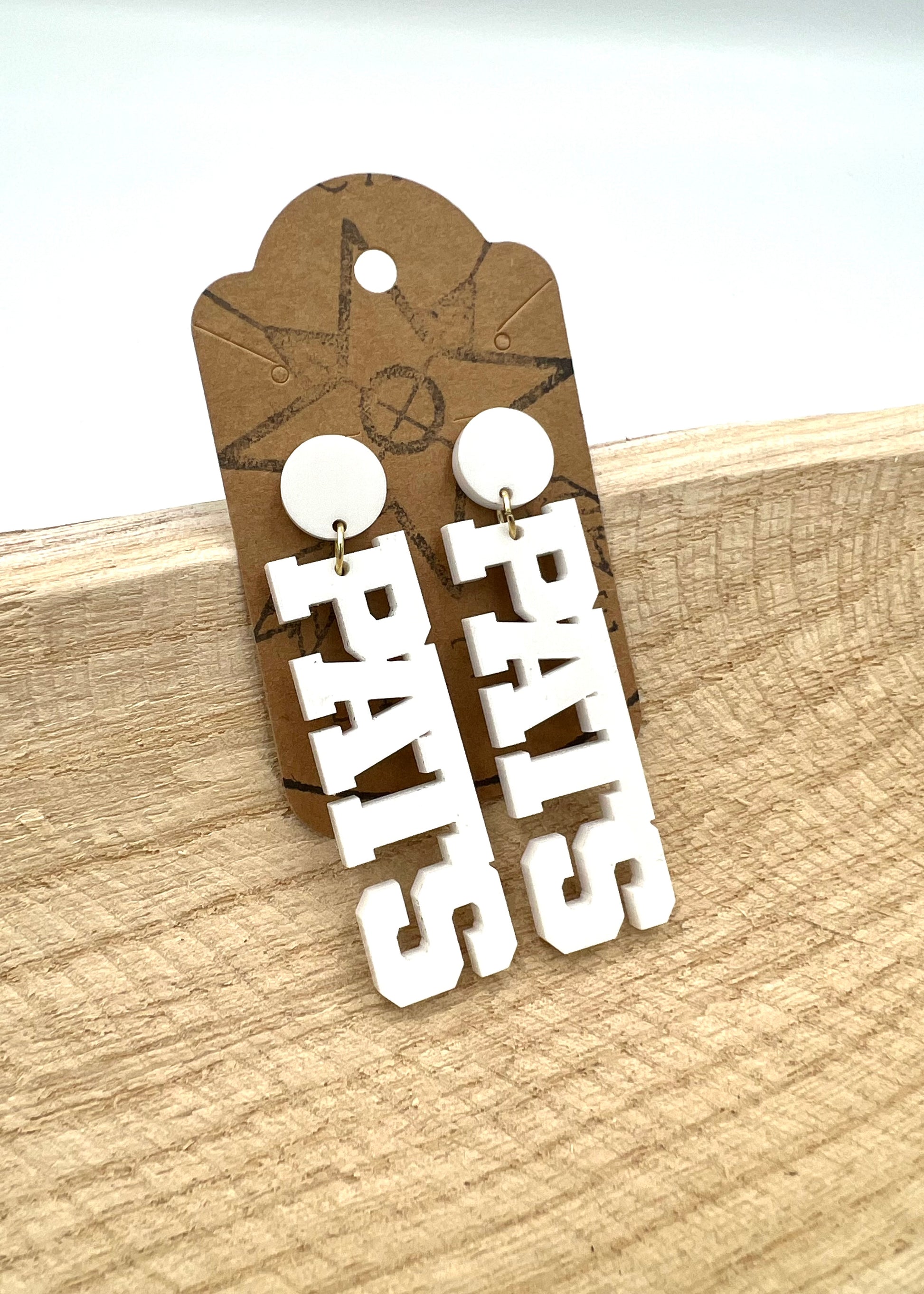 These PATS or MANN acrylic earrings are lightweight and will light up your wardrobe with school spirit. Show your Patriot pride in style with these unique letter earrings. Perfect for any JL Mann fan!